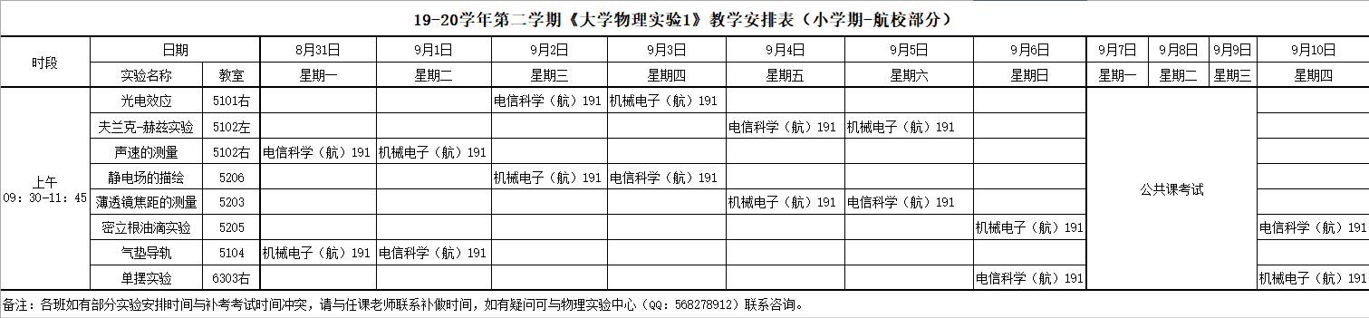 电信科学(航)191和机械电子(航)191《大学物理实验1》课程的教学安排