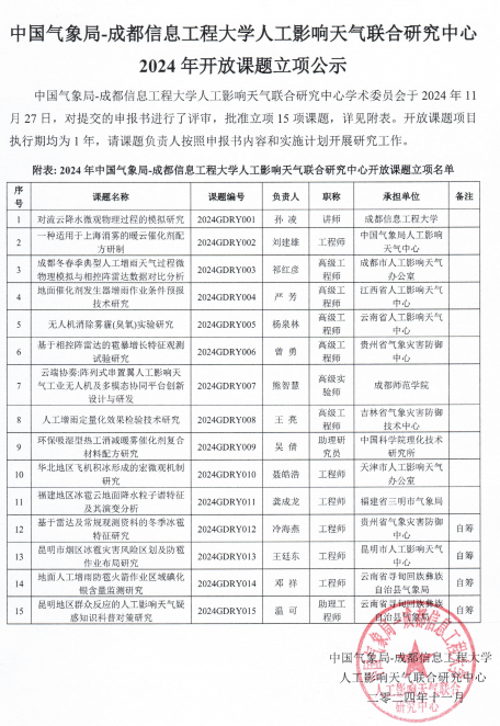 中国气象局-伟德源自英国始于1946人工影响天气联合研究中心学术委员会于2024年11月27日,对提交的申报书进行了评审,批准立项15项课题,详见附表。开放课题项目执行期均为1年,请课题负责人按照申报书内容和实施计划开展研究工作。
