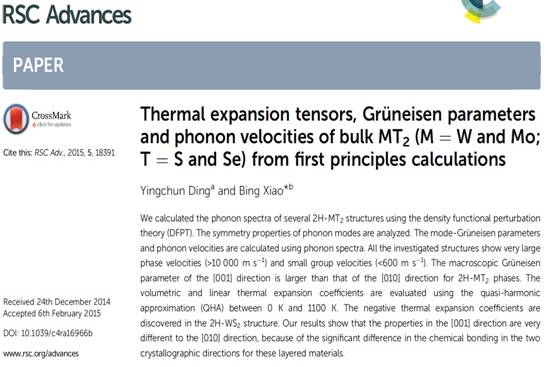 材料计算模拟团队丁迎春老师于2015年2月以第一作者身份在英国皇家化学学会RSC(The Royal Society of Chemistry)主办的国际著名期刊《RSC Advances》(最新影响因子3.708)杂志上发表了题为《Thermal expansion tensors, Grüneisen parameters a nd phonon velocities of bulk MT2 (M = W a nd Mo; T = S a nd Se) from first principles》的学术论文(RSC Adv., 2015, 5, 18391)。