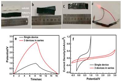 柔性能量存储及其阵列器件是可拉伸和可穿戴电子器件技术领域的核心部件,具有十分重要的研发价值和意义。其中,微型柔性电化学超级电容器不仅能作为独立的元件为电子器件系统存储能量,还有望取代电池直接给微系统供电,是发展高性能柔性可穿戴电化学电容及其阵列器件的重要技术基础。本文提出一种简单可控的方法制备柔性微型超级电容器件,主要是基于化学气相沉积工艺在柔性织物基底上生长具有多孔结构的电极材料。受益于导电聚合物与二硫化钼间的协同作用,制备的PEDOT:PSS/MoS2/PEDOT三元复合电极在0.1 mA cm−2电流密度下拥有大面积电容 51.01 mF cm−2 (408 F/g),并且循环5000次,仍保持着93.6%的容量。此种柔性电极组装的微型器件能成功驱动一个额定电压为2V的LED灯工作。