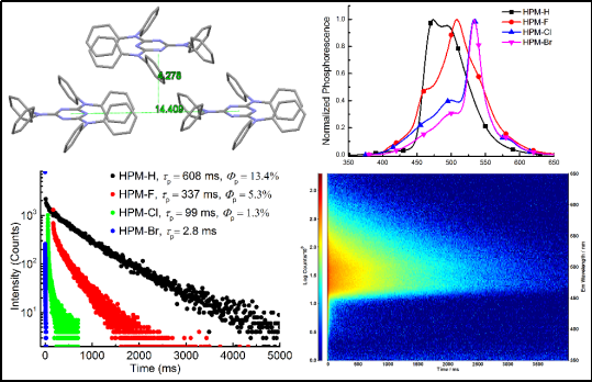 Ultralong room-temperature phosphorescence remarkably weakened by halogenation-induced molecular packing in hexaphenylmelamine derivatives |