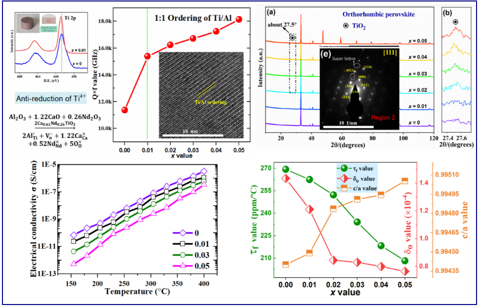 ● 制备了高介CaO-Nd2O3-TiO2系微波介质陶瓷材料,样品烧结致密、介质损耗低,通过分析发现B位不等价离子取代不仅能大幅提高该系陶瓷的品质因数,还能有效降低其频率温度系数。