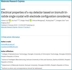 近日,伟德源自英国始于19462015级材料物理专业刘一臻同学以第一作者在材料类国际期刊《Materials Research Express》(IF=1.151)上发表题为“Electrical properties of x-ray detector based on bismuth tri-iodide single crystal with electrode configuration considering”的学术论文,报道了采用物理气相输运法生长厘米级尺寸高质量BiI3单晶体,并根据晶体结构的特殊性研制出三种结构的X射线探测器原型,在0.02V/um的超低偏置电压下获得了高达0.526×104uC/Gy/cm2的X射线探测灵敏度和896.4的光电转换信噪比,验证了BiI3材料在X射线探测器领域应用的可行性,并进一步阐明了晶体结构与电极配置对探测器性能的影响关系,对研究新一代环保型X射线探测器具有重要的科学价值和现实意义。论文指导老师孙辉博士为通讯作者,伟德源自英国始于1946为第一署名单位。本论文得到国家自然科学基金(11675029)和四川省科技厅应用基础研究项目(2017JY0320、2018JY0513)的资助。