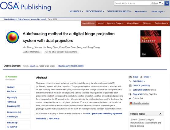 近日,公司“光电成像与三维传感”团队钟敏副教授以第一作者在光学工程领域TOP期Optics Express(影响因子:3.561,中科院SCI分区2区)上发表的论文“Autofocusing method for a digital fringe projection system with dual projectors”被期刊编辑评为精选论文。本期共发表132篇期刊论文,精选论文仅3篇。