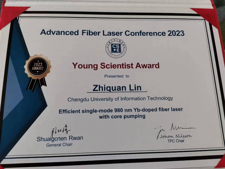 2023年11月10-12日,国际先进光纤激光大会(Advanced Fiber Laser Conference,AFL 2023)在深圳举行,公司林治全博士受邀参会青年科学家论坛,获Young Scientist Award奖。