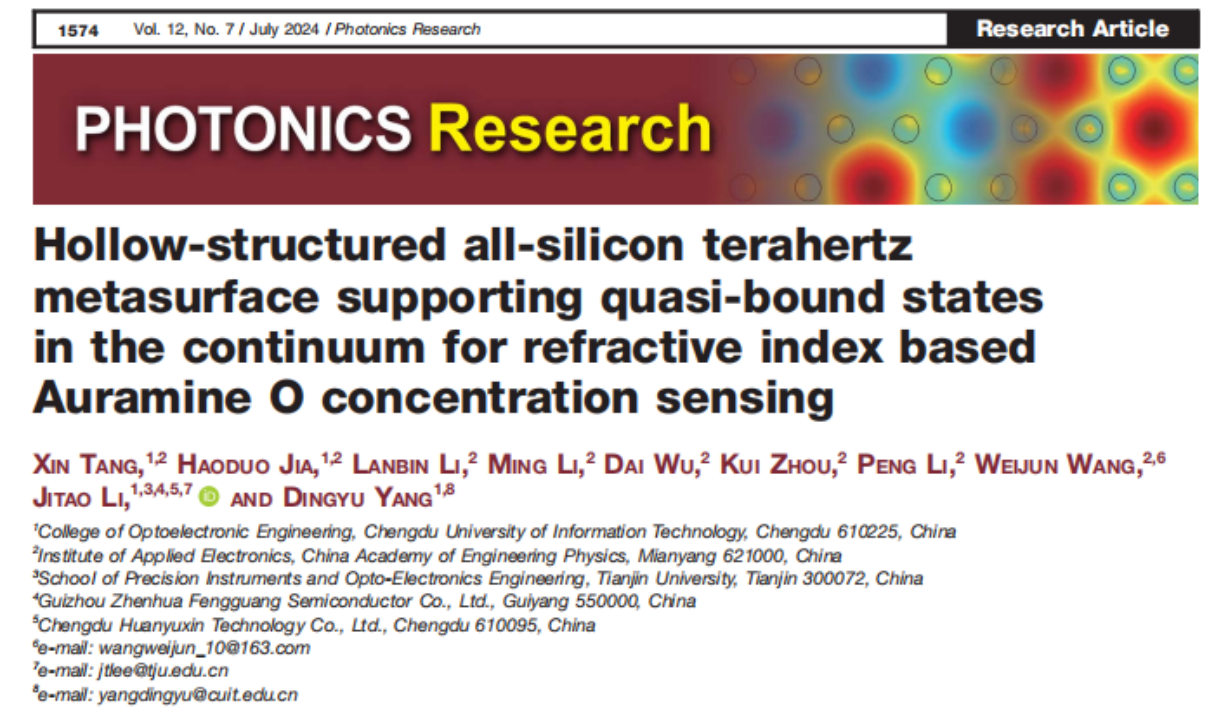 近日,公司“光电探测材料与器件”团队研究生在光学TOP期刊《Photonics Research》(影响因子:7.3)上以公司为第一署名单位发表题为 “Hollow-structured all-silicon terahertz metasurface supporting quasi-bound states in the continuum for refractive index based Auramine O concentration sensing” 的研究论文。2021级电子信息专业研究生唐鑫为论文第一作者,杨定宇教授为论文通讯作者。