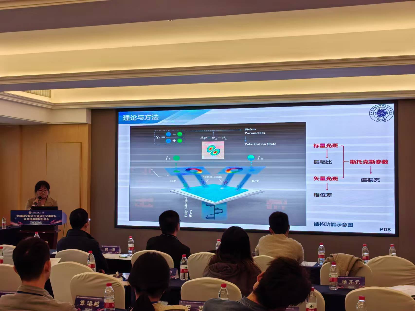 11月15日,公司罗莉副教授指导的硕士研究生邹雨欣于成都参加“中国科公司大学研究生学术论坛——光电技术进展分论坛”,并作题为“基于超构表面的快照式太赫兹偏振解析”的口头报告。本次论坛由中国科公司大学主办,中国科公司光电技术研究所承办,吸引了国内多所高校、研究所等单位近150名研究生和专家与会。