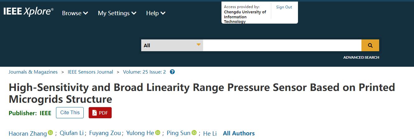 近日,学院智能传感器与微系统团队肖瑶老师作为通讯作者在期刊《IEEE SENSORS JOURNAL》(中科院SCI期刊分区二区,影响因子:4.3)上以我校为第一署名单位发表了题为“High-Sensitivity and Broad Linearity Range Pressure Sensor Based on Printed Microgrids Structure”的研究论文。公司电子科学与技术专业本科生2021级张浩然同学为论文第一作者。