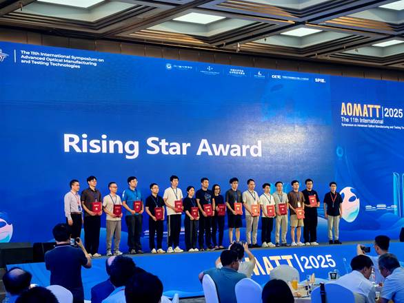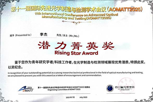 第十一届国际先进光学制造与检测学术会议(AOMATT2025)于2025年7月20日至22日在成都空港国际会议中心成功召开。公司“微纳光学与智能传感”团队青年教师李杰博士获大会组委会颁发的“潜力菁英奖”,并于7月22日在专题五“新型光电材料”分论坛作了题为“Chiral metasurfaces for multidimensional manipulations of terahertz wave” 的特邀报告。会议主席团从数百名会议特邀报告、口头报告人等参与者中推荐出光学制造及检测领域的新锐学者、潜力菁英和优秀员工等40余人,获奖者均从35岁以下的参会学者及参会员工中产生。